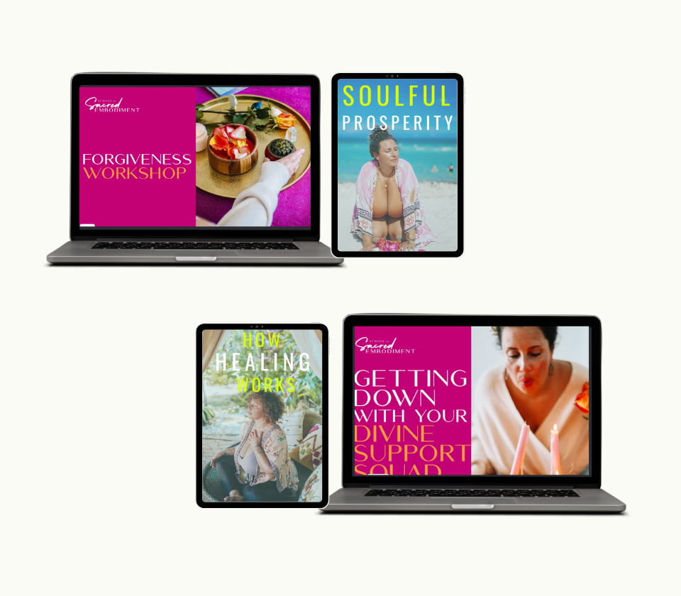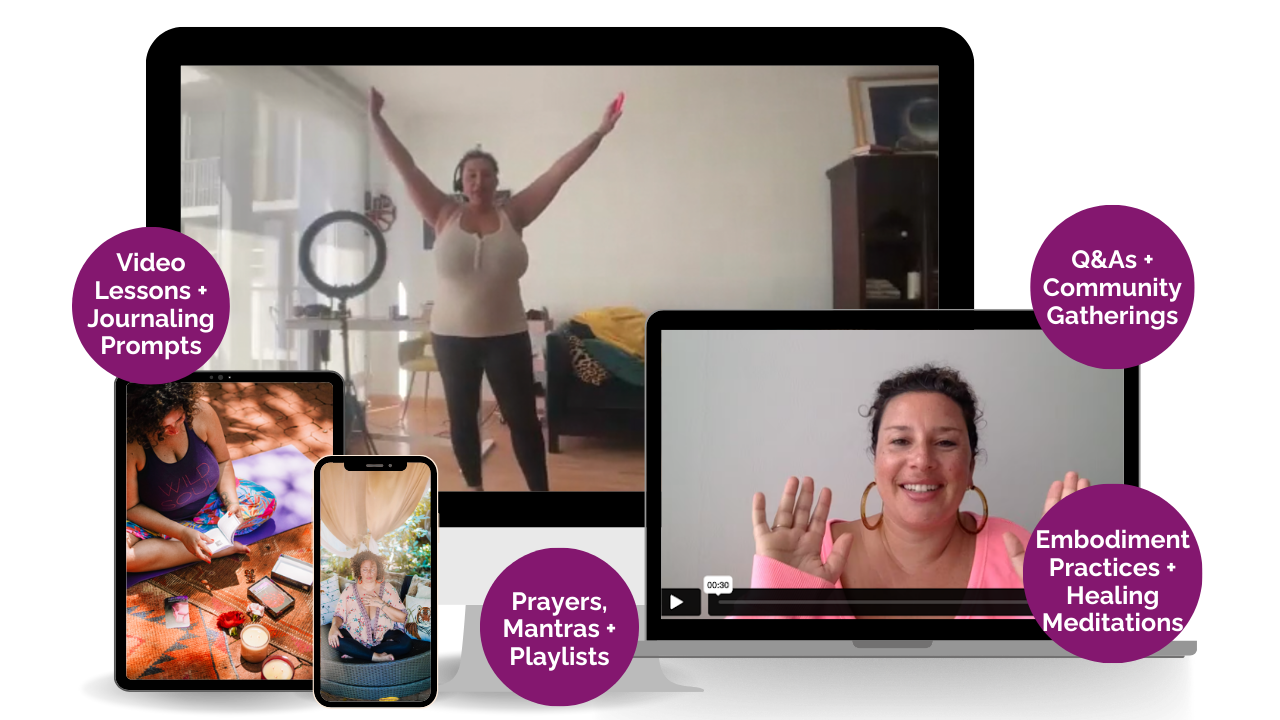 I know that sounds like AN ENORMOUS TASK, but it’s not as daunting as it sounds when you’ve got proper support, resources to lead you through it and, most importantly, when none of it is rigid or oppressive! Through our video lessons, movement practices, prayers, mantras, rituals, healing meditations, journaling prompts, playlists, Q+As, and monthly Zoom community circles, we’ve got layers and levels of resources to meet you exactly where you are and create a unique and tailored journey to help you do it.