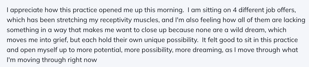 Being able to re-listen, and contemplate each part of the framework, seeing it evolve and reveal itself to me over time, allowed me to really hear things Elizabeth said. I thoroughly enjoyed the workshops, the movements and the community itself. I always looked forward to showing up. Listening to the other women, appreciating the way it made me think, sink into something or have those ah-ha moments.