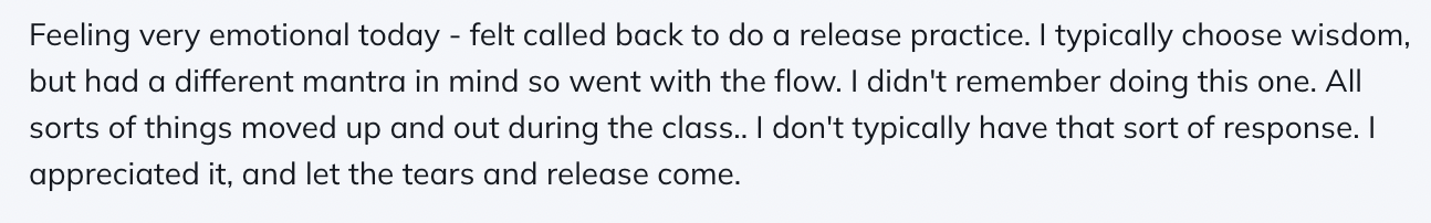 The consistent practices have helped me to open an honest, exquisite and loving dialogue with my body, my heart and soul, and the Divine/Source/Spirit.