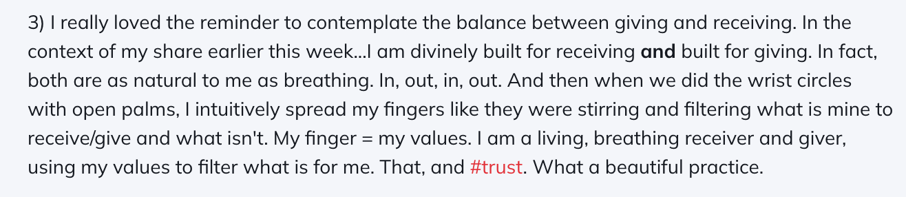 This added a layer of exploration that was more introspective and tender than previous rounds. At the same time, it was incredibly expansive and energizing. It’s led to a surprising softening and strengthening of relationships, both with myself and with others. If you’re looking for a program that supports depth and breadth in your embodiment journey, I can’t recommend POWER enough.
