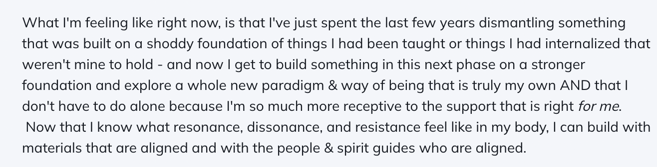 Most of programs have been open to people at all stages of their spiritual journey. This one is not. It’s also not a place for healing trauma. If you’re someone who’s exploring spirituality and isn’t sure what you believe in, don’t have any consistent practices, and feel connected to the Divine (or whatever you call it), this is not the space for you. Likewise, if you’re working through any Big T trauma right now, POWER is not an appropriate container.